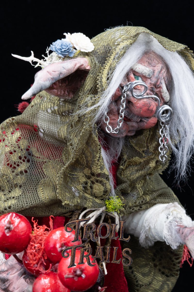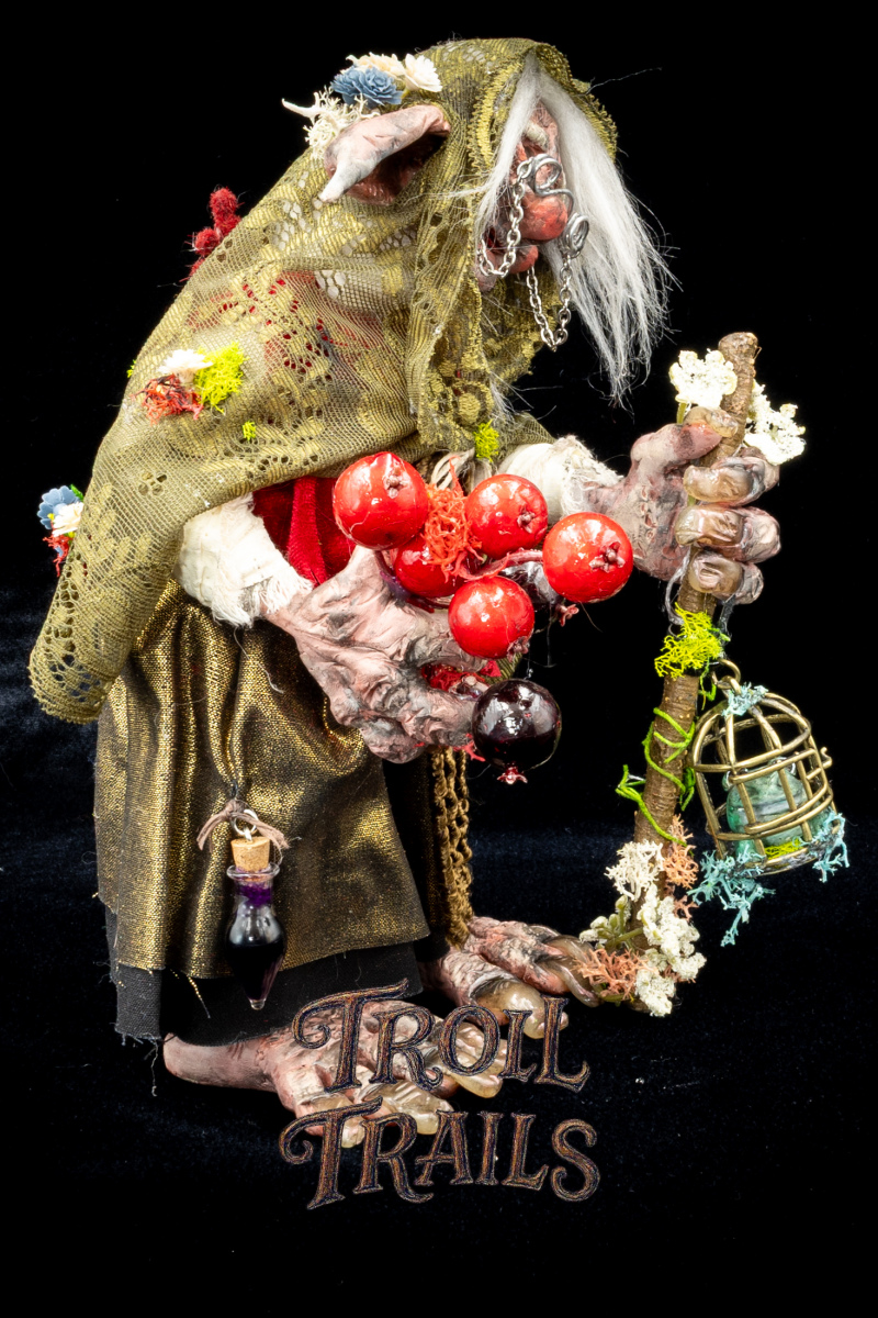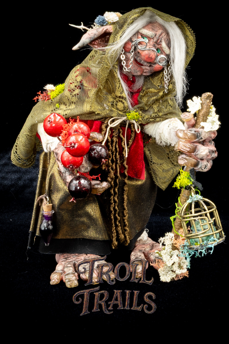 Grimga is a forest elder, her body bent by time and her gnarled knuckles carrying the weight of the forest years. An enigma the other trolls speak of in hushed tones. Some say she is a witch always foraging and always brewing. While others know her to be a healer and a guardian. A friend to all who respect the balance of nature.